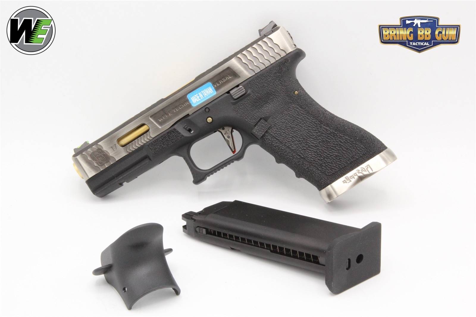 อ่านรีวิว บีบีกัน ยี่ห้อ We รุ่น Glock17 Custom (สไลด์สีเงิน ท่อสีทอง บอดี้สีดำ) ปืนสั้นอัดแก๊สยี่ห้อ WE ผลิตจากประเทศไต้หวัน Glock17 Custom มาพร้อมของแต่งครบครัน เช่น ศูนย์หน้าหลังเรืองแสง สไลต์แต่ง ท่อนอกสีทอง ไกแต่ง บ่อแม็กอลูมิเนียม
